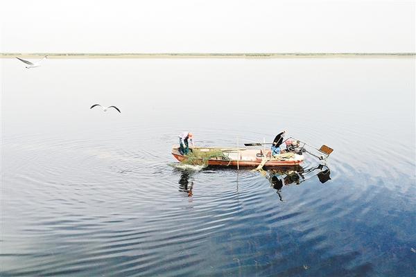 9月2日,博湖县的渔民在博斯腾湖捕鱼。近年来,新疆博湖县贯彻“绿水青山就是金山银山”的理念,加大开都河生态景观带建设力度,全力推进环境整治和生态修复,形成“水在城中流,城在水中映,人在水边行”的绿色画卷。新华社记者 丁磊 摄