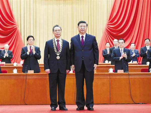 9月8日,全国抗击新冠肺炎疫情表彰大会在北京人民大会堂隆重举行。中共中央总书记、国家主席、中央军委主席习近平向“共和国勋章”获得者钟南山颁授勋章后留影。
