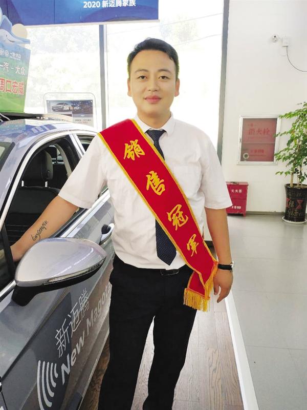在周口宏威一汽大众4S店,有一位传奇的金牌销售,在入职4年的时间里,他曾获得过20余次月度销冠、3次年度销冠,单日最高销售7台,单月最高销售26台,曾连续3年被评为优秀员工,当选公司工会主席。他就是金森,一位来自淮阳的小伙。