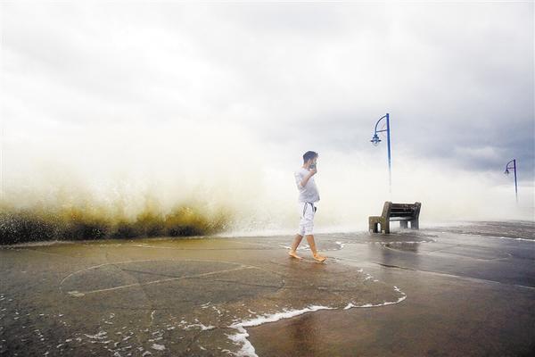 9月15日,在美国路易斯安那州新奥尔良,一名男子身后巨浪拍岸。