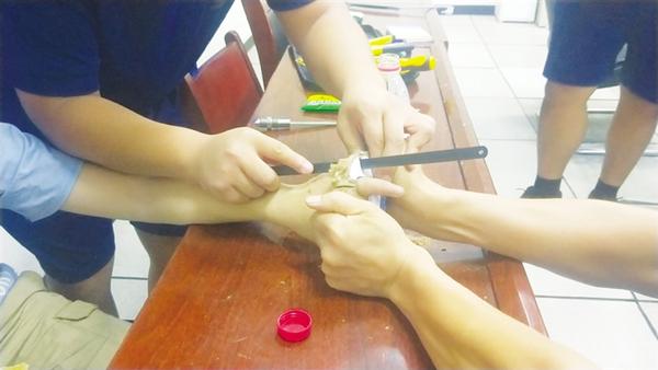 看到救援人员,小男孩不好意思地说:“我看桌子上有个孔,就是想看看手指能不能伸进去,结果就拔不出来了。”救援人员经观察发现,小男孩左手无名指被卡在课桌木板上的小孔里,木板已被裁下,木板材质为锯末压缩板,此时小男孩手指被卡部位周围已发生肿胀,必须马上处理。救援人员利用钢锯将木板一点点锯开,然后又用钳子将木板夹开,经过3分钟救援,成功将禁锢小男孩手指的木板摘除。看到木板被从手上取下,男孩长长地舒了口气。