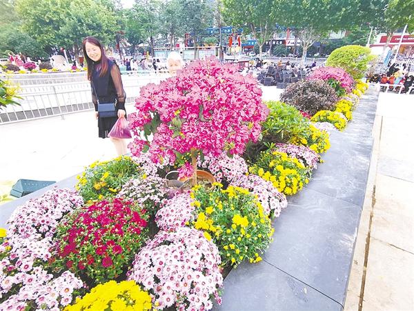 国庆节临近,中心城区五一文化广场装扮一新,各色花卉和造型树木分布在广场的各个方位的花坛内,吸引市民观赏拍照。图为9月27日,市民在鲜花盛开的花坛前驻足观看。 记者 孙安平 摄 ②9