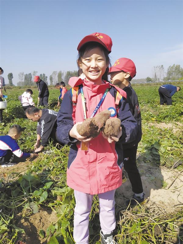 当日上午,小记者们赶到葡实庄园后,先品尝了主人用地锅蒸的红薯,又甜又面的红薯,家长和孩子们吃得津津有味。然后,大家走进田间,挥舞起手中的农具挖红薯。有些孩子嫌自带的铲子不给力,干脆挽起袖子,徒手在地里挖了起来。灿烂的阳光下,脸上满是汗水的小记者们收获满满,他们竞相举起硕大的红薯,让老师或家长拍照。有的小记者高兴地说:“这下可以过个‘红薯年’了。”有的孩子说:“以前只知道吃,现在自己挖的自己吃,一定更香。”大家还决定,回去后要自己动手蒸红薯、烤红薯、炸红薯,将“自己动手,丰衣足食”带来的欢乐进行到底。