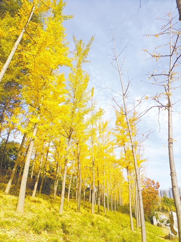 一朝身入银杏林,叶落风卷满地金。进入深秋,银杏树的叶子由绿色渐渐变成金黄色。金灿灿的叶子在阳光的映照下,显得格外漂亮。图为周口公园的银杏林。③5记者 宋海转 摄