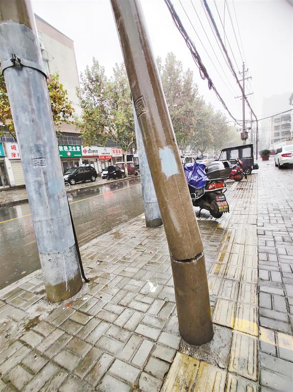 11月17上午,记者在文明路与黄河路交叉口附近看到,文明路与黄河路交叉口路东的一根电线杆下面已经断裂,向路面方向侧倒,而侧倒的电线杆一头搭在另一根电线杆的电缆上。由于底部断裂,该处存在安全隐患。①15