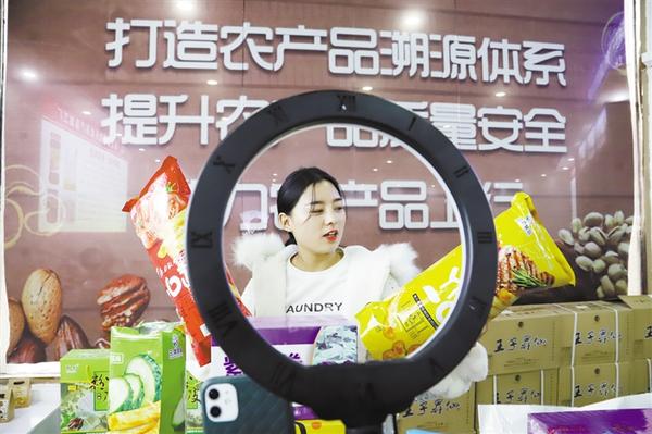 11月30日,在郸城县电子商务服务中心,网红正在直播带货,3分钟接到7个订单。薯条、粉条、烤鸭蛋、麻花……这些网红产品有一个共同的名字——“老家丹成”公共商标。