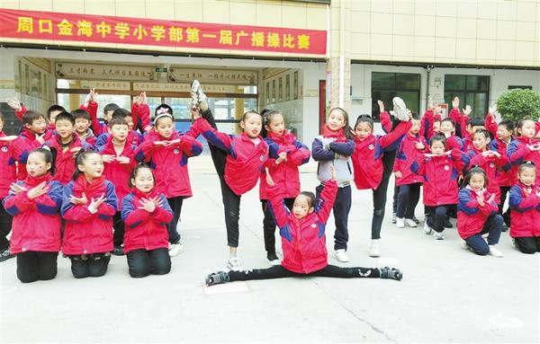 11月27日上午,周口金海中学小学部1200多名师生在教学楼前,享受了一场视觉盛宴。当天,该校小学部第一届广播体操大赛成功举行。赛后,该校领导为优胜班级颁发锦旗和奖状。图为比赛现场。