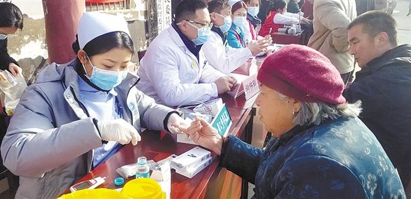 义诊现场,前来求医问诊的村民络绎不绝,医院专家和志愿者耐心细致地使用血压计、听诊器、血糖仪等医疗器械,逐一为问诊村民体检后,开具健康处方,并向他们普及健康知识。