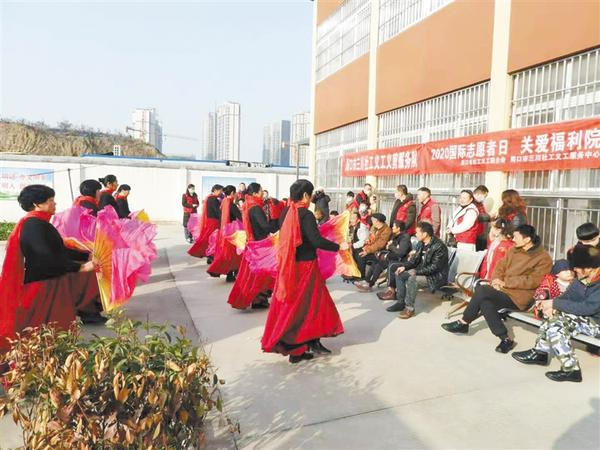 志愿者为老人和孩子们表演文艺节目。12月6日上午,由周口市三川社工义工服务中心(周口义工)组织的志愿者来到川汇区福利院开展慰问活动。他们为老人和孩子送去了牛奶、面包、火腿肠等生活用品,义务为他们理发、剪指甲,并献上了精彩的文艺节目。 记者 窦娜 摄