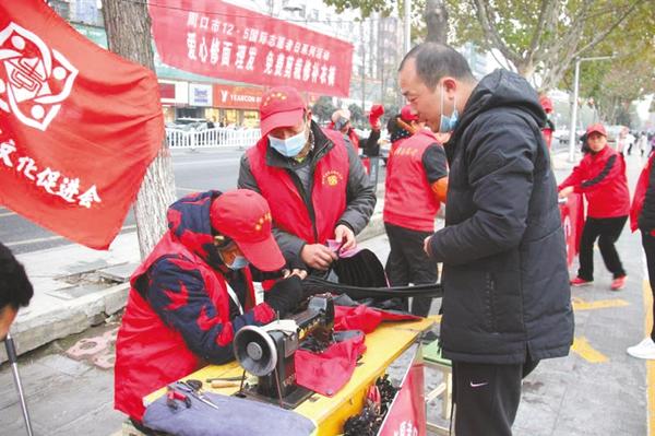 志愿者在为市民免费修补衣裤。12月6日下午,周口市慈孝文化促进会、周口环境保护协会的志愿者来到周口中心城区五一文化广场,开展以爱心剪发、免费剪裁、修补衣裤为主要内容的便民志愿服务活动。②10