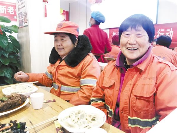 昨日中午,两名中心城区环卫工人在谷万家免费就餐。当日,谷万家宴请了近300名环卫工人共过冬至。