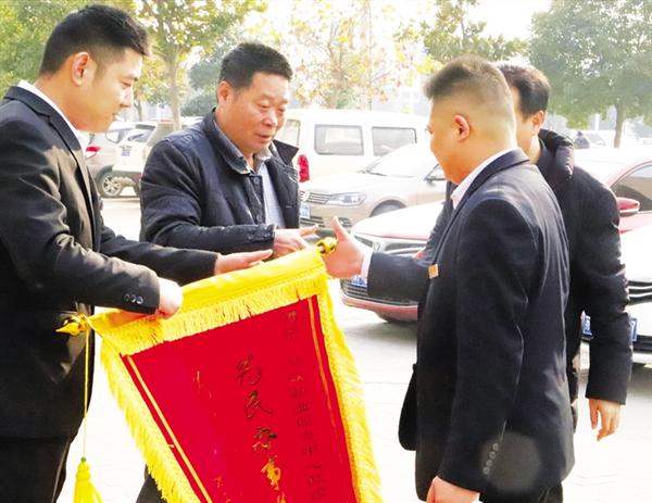 本报讯 12月18日上午,万正世家物业部来了两位特殊的访客。他们心情激动,眼含热泪,将一面绣有“为民办事关怀备至,为民排忧情深似海”字样的锦旗交到物业部赵经理手中(如图),连说:“谢谢,谢谢你们!”