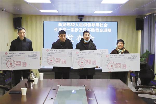 本报讯 近日,川汇区人民法院召开了高龙等32人组织领导黑社会性质罪一案涉及民事赔偿金退赔发布会,集中对以高龙为首的组织、领导、参加黑社会性质组织案件的多名被害人进行退赔,退赔总额共计173.555万元。