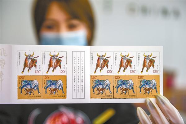 当日,中国邮政发行《辛丑年》特种邮票1套2枚,图案分别为“奋发图强”“牛年大吉”。 新华社记者 张楠 摄