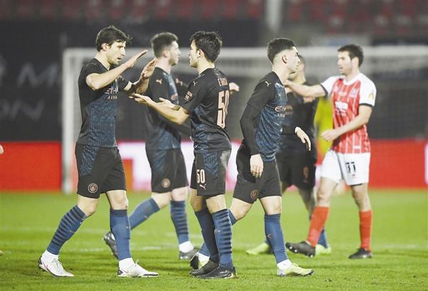 1月23日,曼城队球员在赛后庆祝。 当日,在2020~2021赛季英格兰足总杯第四轮比赛中,曼彻斯特城队客场以3:1战胜切尔滕纳姆队。新华社发