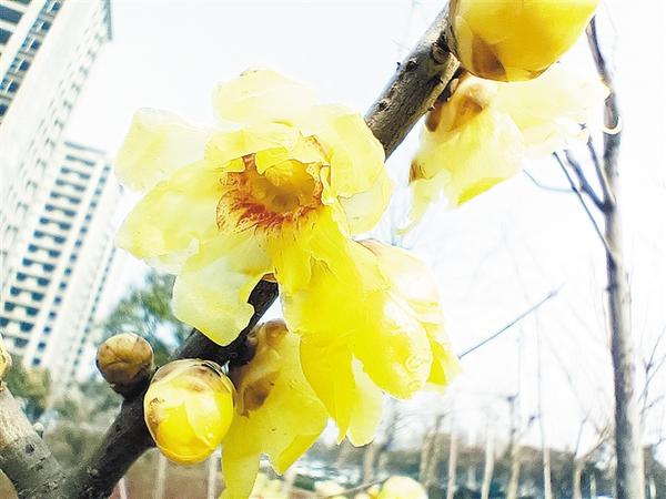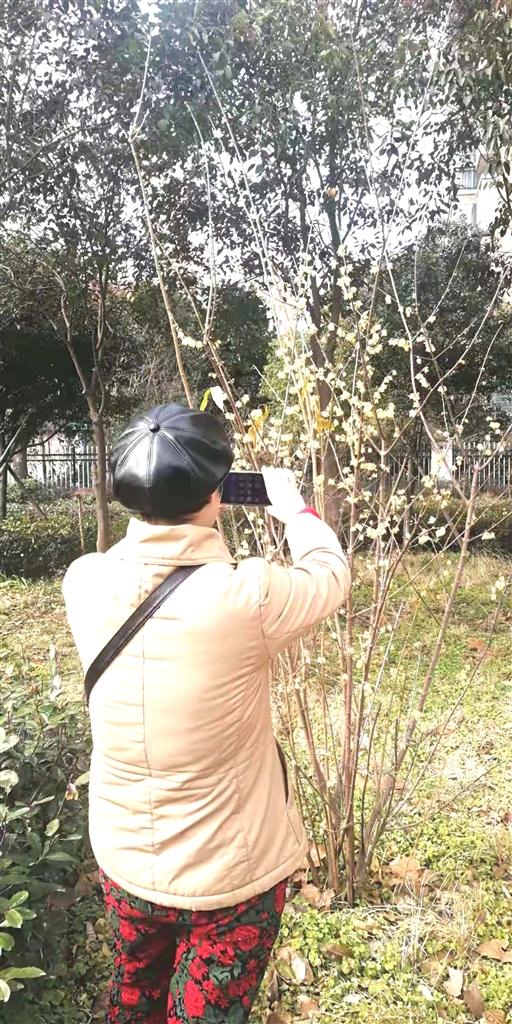昨日,中心城区文昌大道与周口大道交叉口南侧一街头游园内,蜡梅盛开,微风吹来,阵阵飘香,成为冬天里一道靓丽的风景线。图为市民在游园内赏梅、拍照。记者 马月红 摄