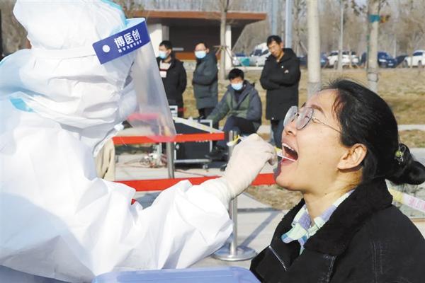 1月30日上午,市城乡一体化示范区疫情防控应急演练参演人员模拟为一名外出务工人员咽拭子采样。