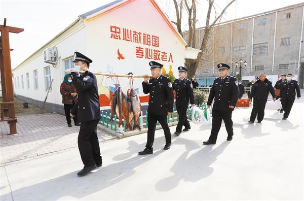 1月29日,太康县公安局逊母口镇派出所民警为逊母口镇敬老院的老人们送去60斤鱼、100斤鸡蛋和2袋面粉等慰问品。 民警来到老人们身边,帮助打扫卫生,宣传安全知识。记者 张洪涛 摄