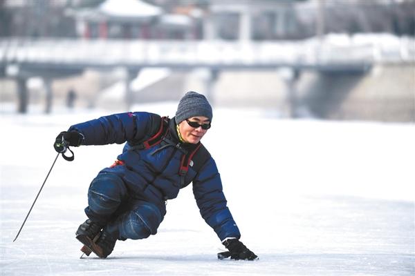 当日,单刀冰车爱好者来到长春市伊通河畔的冰场滑冰,乐享冰趣。单刀冰车俗称“单腿驴”,用几块木板和单片冰刀拼接而成。滑单刀冰车是东北地区常见的一项群众冰上娱乐健身活动。