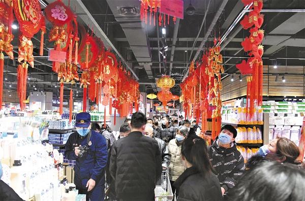 2月9日上午,商水县行政路一大型超市内年货充足,人流如织,市民自觉佩戴口罩进入商场“扫货”。