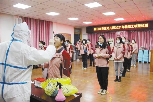 昨日,市直幼儿园教职工在进行新冠肺炎核酸检测。为保证市直幼儿园顺利开学,按照市教体局统一安排部署,近日,周口市妇女儿童医院核酸检测组对市直幼儿园全体教职工百余人进行了新冠肺炎核酸检测,检测结果在校老师全部健康,无异常。记者 孙安平 摄