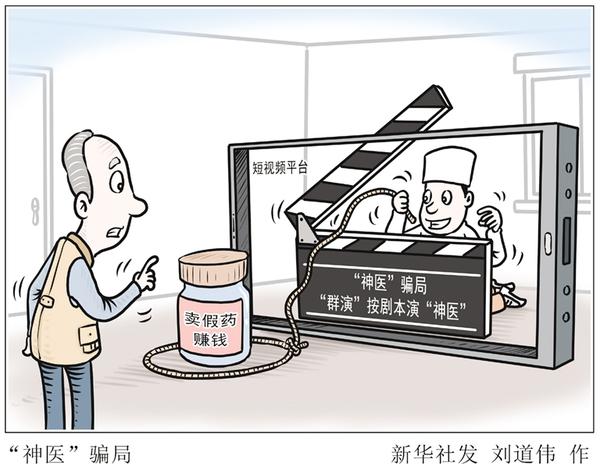 在视频平台上劲爆表演的“神医”并非医生,更非来自医学世家,不过是一群“群演”在按剧本演戏而已。“神医”是幌子,卖假药赚钱才是目的。消费者不但钱财被骗,疾病治疗也被耽误。“神医”公然行骗,监管部门必须依法严惩。