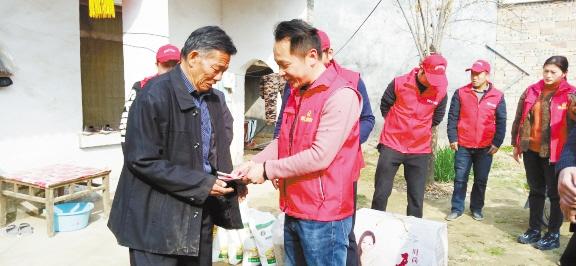 本报讯 3月5日,是学习雷锋日。当日下午,西华县名匠现代装饰总经理雷永胜带领儿子雷杨华和10余名员工来到困难群众王学增和叶顺清家中,为他们送去米、面、油、棉被及500元慰问金。