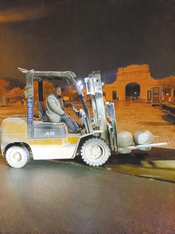 当日晚上8时许,只见一辆小型叉车在周口公园门前铲起两个石墩子后,奔向另外一处临时设置的物品存放点放下,经过两个多小时反复挪移,挡在周口公园门前的数十个石墩子全部被挪走。