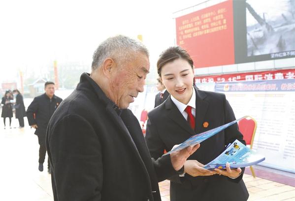 3月15日上午,太康县法院组织法官在县人民广场开展以“守护安全 畅通消费”为主题的“3·15”国际消费者权益日普法宣传活动。活动中,法官们利用宣传展板、宣传资料向群众宣传《民法典》《消费者权益保护法》《食品安全法》等法律法规,详细介绍了法院相关立案诉讼流程,并就群众提出的网购陷阱、保健品销售骗局、网络电信诈骗等热点问题,生动、清晰地分析解答,正确引导消费者如何运用法律武器维护自身合法权益。记者 姬慧洋 摄