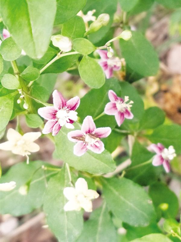 除了春天的枸杞芽是美味,在我眼里枸杞更多的是用来欣赏的。特别喜欢它紫色的五瓣小花,纤柔的花瓣围着几根洁白的花蕊,看起来小小巧巧、清清秀秀、安安静静的。它开起花来,一茬又一茬,从夏至秋都常见。记得有一次霜降节气还见到这清雅可人的小花儿,当时还替它担心:此时开花儿,还来得及修成正果吗?