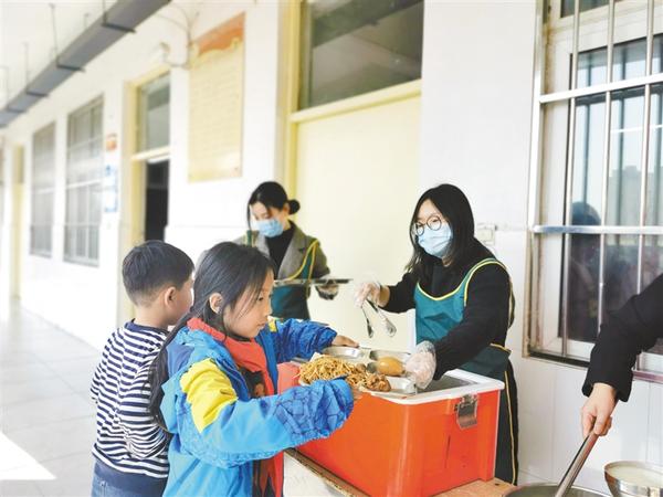 中午就餐时间,记者在每个班级的教室外看到,刚刚放下教鞭的老师又戴上了口罩。只见他们套上手套,系上围裙,一边指挥着学生排队领饭,一边尽心为学生盛饭。从分餐、配餐到学生全部就餐完毕,老师相当于上了一节课,然后才吃上一口饭。饭后,他们又要着手组织学生外出散步、活动,随后再回到教室打扫班级卫生,开始准备中午延时辅导工作。