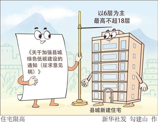 住房和城乡建设部近日公布的《关于加强县城绿色低碳建设的通知(征求意见稿)》要求,限制县城居住建筑高度。县城居住建筑高度要与消防救援能力相匹配。县城新建住宅以6层为主,6层及以下住宅占比应不低于75%。县城新建住宅最高不超过18层。确需建设18层以上居住建筑的,应严格充分论证,并加强消防应急、市政配套设施等建设。 新华社发 勾建山 作