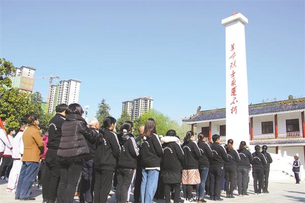 当日8时许,志愿者们在革命烈士纪念碑前肃穆而立,并向长眠于此的烈士敬献花圈。志愿者队伍中,年龄最小的5岁、最大的67岁。