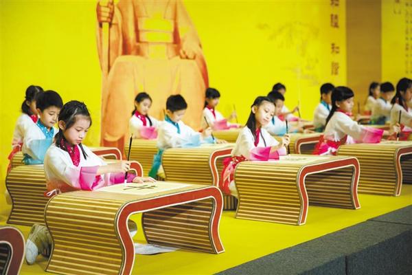 在“高唱颂歌”环节,30名澳门小学生身穿汉服,边唱《黄帝颂》边用鹿邑“天地人”毛笔书写毛笔字。随后,孩子们举起书写的姓氏,后排两名身穿汉服的老师打开“中华百家姓”卷轴,引来参加拜祖活动的来宾阵阵掌声。