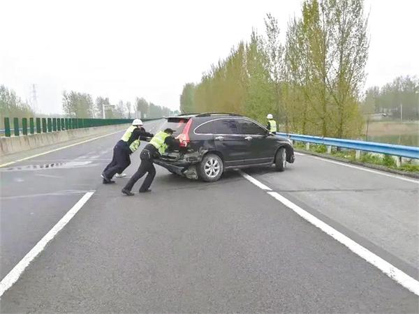 本报讯 近日,记者从周口市交通管理支队获悉,大广高速周口段从北往南方向2081公里附近,一辆黑色SUV旋转360度碰撞高速公路护栏后停在超车道内,十分危险。周口高速交警赶到现场后,立即组织人员推车,把车辆移到应急车道。