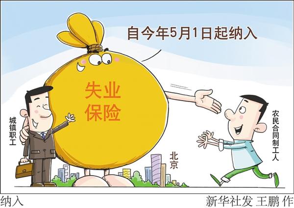 为保障失业人员基本生活,北京市人力资源和社会保障局、市财政局、市税务局日前联合印发《关于统一城乡劳动者失业保险政策的通知》,自今年5月1日起,北京市统一城乡劳动者失业保险政策,农民合同制工人与城镇职工同等缴纳失业保险费,同等享受失业保险待遇。 新华社发 王鹏 作