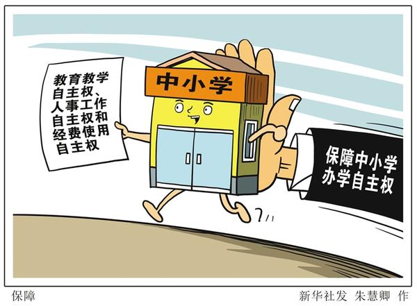 办学活力不足,是制约中小学教育教学质量提升的重要因素。教育部基础教育司司长吕玉刚近日表示,激发中小学办学活力,必须处理好政府办学主体责任和学校办学主体地位之间的关系,明晰政府和学校权责边界,做到应放尽放、放管结合。 教育部等八部委去年联合印发了《关于进一步激发中小学办学活力的若干意见》。文件提出保障学校三个方面自主权,即教育教学自主权、人事工作自主权和经费使用自主权。在政府层面,放权既要坚持“能放的全部放”,又要做到“精准定向放”,根据学校实际能力水平实现差异化放权。 新华社发 朱慧卿 作