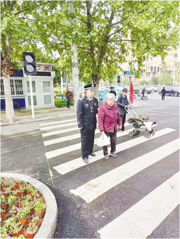 4月25日下午,周口市公安局城乡一体化示范区分局党委委员、副局长刘峰和民警杨勇在庆丰路和中原路交叉口执勤时,发现一位70多岁的老人步履蹒跚地往马路对面走。随后,杨勇搀扶着老人过马路。