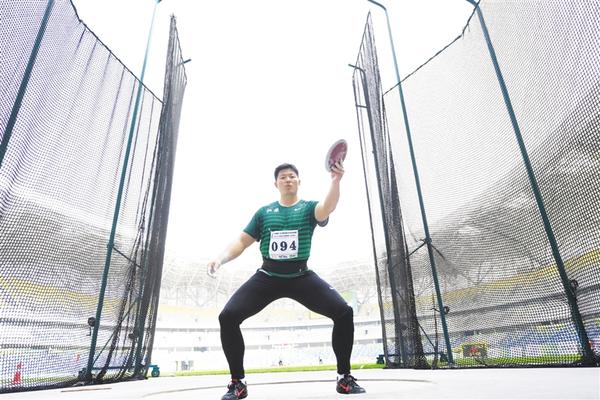 当日,在陕西西安举行的全运会田径项目测试赛暨2021年田径分区邀请赛(西北赛区)男子铁饼决赛中,江苏铁人队选手吴健以56米58的成绩获得季军。新华社记者 李一博 摄