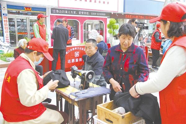 5月5日上午,周口市慈孝文化促进会的志愿者为市民修补衣服。当日,周口市慈孝文化促进会的志愿者在位于周口中心城区文明路与交通大道交叉口附近的市民驿站,开展“学党史,办实事,文明实践志愿服务社区行”活动,用实际行动给广大市民送去关爱,受到市民一致好评。