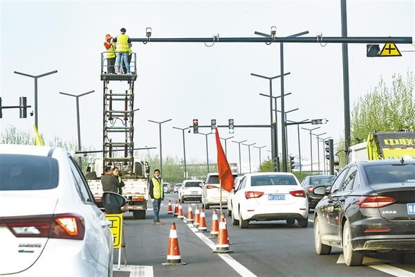 昨日,施工人员在周淮路上安装电子眼。为保障道路交通安全有序,近日,有关部门对周淮路的红绿灯路口开始安装电子眼,对违章车辆进行监督。记者 梁照曾 摄