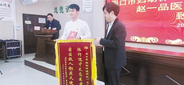 本报讯 5月6日上午,洛阳白云山旅游度假区派代表来到周口市妇幼保健院,将一面印有“旅行途中不忘医者本心 景区救人彰显天使本色”的锦旗和“洛阳白云山终身荣誉游客”荣誉证书送到了该院医生赵一品的手中,感谢他“五一”期间在白云山景区见义勇为的行为。