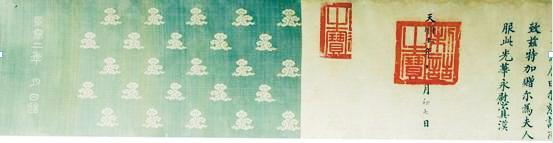 为表彰他的父亲、母亲以及继母刘氏教子有方,为国家培养了一位栋梁之才,明天顺五年,也就是1461年,英宗皇帝颁发诰命,追赠其父轩贵为资政大夫、都察院左都御史,母亲刘氏、继母张氏为夫人。这道诰命长3.5米,宽0.3米,是由“江宁织造”用提花锦缎织成的五彩锦缎制品。底色由蓝、浅黄、深黄、白、绿五种颜色构成,祥云图案作底纹,右端织有“奉天诰命”四字篆书,字两边织有银色双龙图案作为防伪标识。圣旨内文为墨书小楷,文后盖有“制诏之宝”朱色玺印,印记落款“天顺五年十二月七日”。“制诏之宝”左上侧为皇家骑缝章,也是防伪标识。圣旨虽年代久远,但字迹仍十分清晰,落款处的印章彰显出昔日皇权无上的威仪。