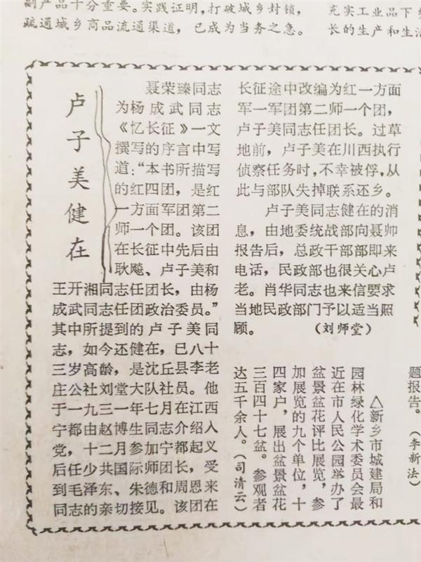 4月9日,周口日报《红色记忆》采访组一行再次来到沈丘县李老庄乡卢子美家乡采访,并到卢子美的墓前凭吊。当时,卢子美墓碑前摆放了一盆白色菊花,花朵在风中摇曳,像是在倾诉着什么。“应该是有人专程过来扫墓了。”卢远东拿起那盆菊花,细心地擦拭底部尘土。他说: “爷爷去世多年,给我们留下了无穷尽的精神财富。勤俭是我们的传家宝,气节是我们做人的标本,诚信待人也是爷爷对我的教导。我们后人要把党的初心传承发扬光大。”③6