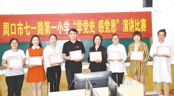 本报讯 为深入开展党史学习教育,5月24日,周口七一路一小举行了“学党史 感党恩”主题演讲比赛。全校6个年级段、体音美组、小科目组和后勤组的9位选手进行了精彩的演讲。