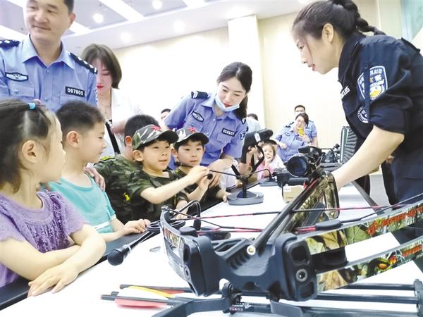 6月1日,市公安局迎来一群特殊的小客人,他们在警用装备展示台前表现出浓厚的兴趣(如图)。这群小客人是50多名公安民警子女,最小的6岁,最大的12岁。当日,市公安局开展警营开放日活动,邀请民警子女走进警营,让他们在这里度过一个快乐的“六一”儿童节。②8记者 张洪涛 摄