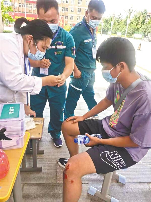 考生骑车摔伤,医务人员及时进行处置。 通讯员 宋全力 黄耀宗 摄