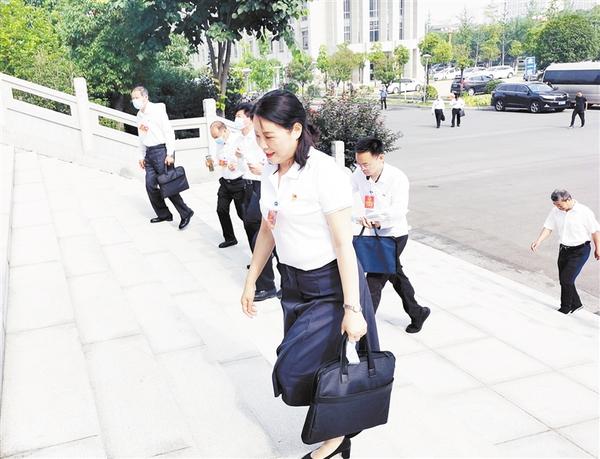 6月10日上午,周口市四届人大六次会议开幕。从8时30分开始,参加本次会议的人大代表们精神饱满、意气风发,怀揣着民意陆续步入会场。记者 孙安平 摄