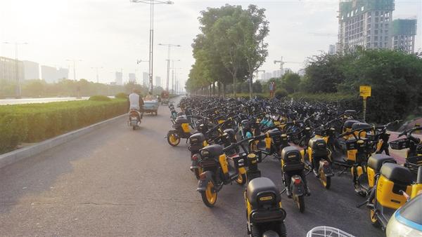 6月23日,市民从周口市中心城区文昌大道东段一大片共享单车旁经过。 当日,记者在该路段看到,在河南科技职业大学对面,数百辆共享单车杂乱无章地停放在慢车道和人行道上,东西绵延500米左右,阻碍行人通行。据负责该路段卫生清扫工作的人员介绍,这么多车子停放在这里,直接影响到了他的卫生清扫工作。在此,记者呼吁有关部门关注此事,还市容市貌整洁有序,还市民出行安全通畅。②9 记者 关秋丽 摄