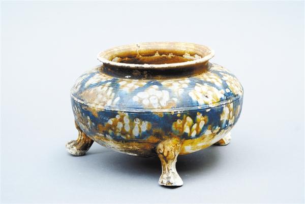 1998年10月,沉睡许久的唐蓝釉三彩炉迎来了它的今世。周口市农村信用社在建工地上,发现了一座唐代墓葬。在其中沉睡的唐蓝釉三彩炉被吵醒,来到了它的新家——周口市博物馆。它敞口,圆唇,短立径,弧肩,鼓腹,下有三兽蹄足支撑它站立,样貌圆润饱满,与唐代艺术丰满、健美、阔硕的特征是一致的。唐蓝釉三彩炉不仅体现了唐代人的制陶工艺和智慧,更是丝绸之路与中西文化和物资交流融合的见证,浑身散发历史与艺术的魅力。